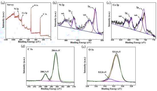 The XPS measurements of NiCo-UMOFs were detected and the results are displayed in Figure 3. The survey spectrum (Figure 3a) demonstrates the presence of Ni, Co, O, and C elements in NiCo-UMOF. In the Ni 2p spectrum (Figure 3b), the characteristic peaks at 855.6 and 873.8 eV are attributed to Ni 2p3/2 and Ni 2p1/2, respectively, with the two satellite peaks at 861.4 and 880.1 eV [28]. In the Co 2p spectrum (Figure 3c), the characteristic peaks located at 781.1 and 797.4 eV correspond to Co 2p3/2 and Co 2p1/2, and the two satellite peaks are centered at 785.6 and 801.5 eV [29]. The above results indicate that Ni and Co ions exist in the form of Ni2+ and Co2+, respectively, in the synthesized NiCo-UMOFs. The C 1s spectrum (Figure 3d) is divided into two peaks at 284.6 and 288.3 eV, which correspond to the bonds of C-C=C and O-C=O, respectively [30]. The O 1s spectrum (Figure 3e) is indexed into two peaks, which are attributed to the metal-oxygen bonds M-O-M (531.0 eV) in the metal oxides and the oxygen in -OH (532.8 eV) [31]. Thus, XPS results verify the formation of the nickel and cobalt phthalic acid phases.