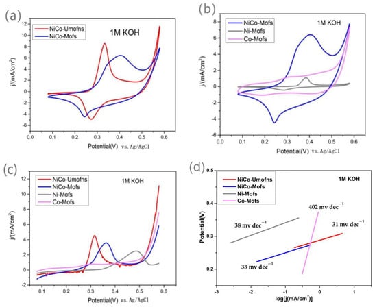 A cyclic voltammetry test was carried out in 1 M KOH, and the results are shown in Figure 4. As shown in Figure 4a, during forward scanning, an oxidation peak of NiCo-UMOFs material appears in the range of 0.25–0.35 V, which may correspond to the conversion of cobalt trivalent into higher-valence cobalt. Due to the occurrence of the oxygen evolution reaction, the current of NiCo-UMOFs rises sharply after about 0.5 V. In the reverse scan, the reduction peak in the range of 0.2–0.35 V should correspond to the reversal of the transformation in the forward scan. It can be seen from the figure that NiCo-UMOFs material has a higher current passing through the same contact area and the same potential. In addition, by comparing the graphs obtained from the CV test of these two materials at 1 M KOH in the figure, it can be clearly seen that the oxidation peak of NiCo-MOFs becomes wider and has a weaker acromion at about 0.35 V and 0.45 V during forward scanning. It is speculated that the characteristic oxidation peaks may be the conversion of cobalt (II) to cobalt (III) and nickel (II) to nickel (III), respectively. It can also be seen from Figure 4b that the electrocatalytic activity of both Ni-MOFs and Co-MOFs is lower than that of NiCo-MOFs. NiCo-UMOFs and NiCo-MOFs showed good electrocatalytic performance in the potential range of 0.08–0.58 V. Moreover, it can be observed clearly that NiCo-UMOFs material synthesized using the ultrasonic method has better electrocatalytic performance.