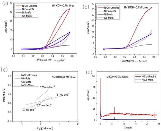In addition, the catalytic activity of UOR on glassy carbon electrode modified by different materials was further studied using the LSV test. As shown in Figure 5b, compared with the other three materials, the initial potential of the Ni-MOFs is higher and the oxidation current generated under the same potential condition is lower. In addition, the NiCo-MOFs, after doping Co, not only reduces the initial potential of UOR, but also produces significant current at a lower potential, indicating that the UOR electrocatalytic performance of Ni-Co bimetallic materials is better. The NiCo-UMOFs demonstrated the largest UOR current density, with onset potentials of 0.32 V (vs. Ag/AgCl). The Tafel curve based on LSV data measured under 1 M KOH + 0.7 M urea condition can be obtained (Figure 5c). The Tafel slope of the NiCo-UMOFs material (51 mV/dec) is much lower than that of the NiCo-MOFs (97 mV/dec), Ni-MOFs (171 mV/dec) and Co-MOFs (201 mV/dec), which indicates that the electrode material has faster reaction kinetics. It is further confirmed that the material prepared using the ultrasonic method has better performance for UOR electrocatalysis.
