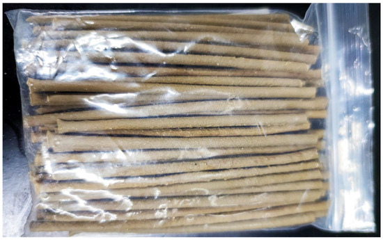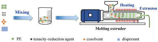The PE blend used as the intermediate products used to prepare the PE composite particles was prepared by the heating-compounding process [35,36,37]. The equipment used was the twin-screw extruder (Korke, Nanjing, China). The preparation process is shown in Figure 1. Firstly, the raw materials were dried in an oven at 70 °C for 12 h. Then the PE particles, cosolvent, tenacity reduction agent, and dispersant were stirred evenly in a specific proportion, and the twin-screw extruder was started at the same time. The twin-screw extruder was preheated for 30 min at 120 °C. The stirred material was added, and the temperature of each heating zone and the feeding speed of the twin-screw extruder were set as shown in Table 1. The twin-screw extruder produced the PE blend at a speed of 100 r/min, and product collection was begun after the twin-screw extruder, producing a uniform cylinder-shaped product. The collected uniform cylindrical blends (shown in Figure 2) are intermediate products used to prepare PE composite particles.