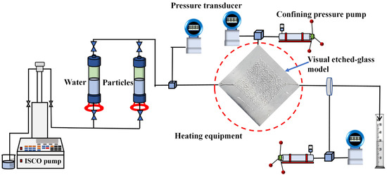 The plugging characteristics of the prepared PE composite particles were evaluated using the visual etched-glass model. The average width of the etched channels was about 200 μm to simulate the fracture network. The experimental schematic diagram is shown in Figure 3, and the experimental process was as follows.