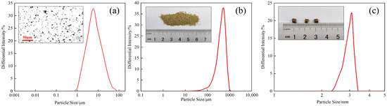 Figure 4 shows photographs and particle size distributions of the PE composite particles prepared with three typical preparation parameters using the low-temperature pulverization method. The results show that the particle size of the PE composite particles presents a normal distribution, and the particle size of most particles is in a similar range. When the PE blend was pulverized with a high grinding speed of 50 Hz, the PE composite particles can be pulverized to a minimum particle size of about 6.0 μm, as shown in Figure 4a. When the grinding speed decreased to 30 Hz, the average particle size of the prepared PE composite particles was about 380.0 μm, as shown in Figure 4b. When the intermediate products were granulated only by a dicing machine without being pulverized by the pulverizer, the prepared PE composite particles were with a maximum particle size of about 3.0 mm, as shown in Figure 4c. It can be seen from the above results that the particle size range of the prepared PE composite particles is controllable from 6.0 μm to 3.0 mm, which meets the injection and plugging requirements for fractures of different scales.
