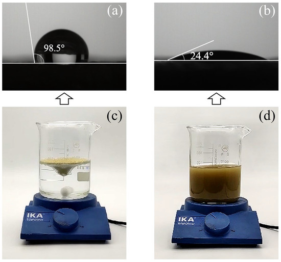 Surface hydrophilicity and dispersibility of composite particles before and after adding the dispersant: (a) contact angle before adding the dispersant (b) contact angle after adding the dispersant; (c) poor water dispersion before adding dispersant; (d) excellent water dispersion after adding dispersant.