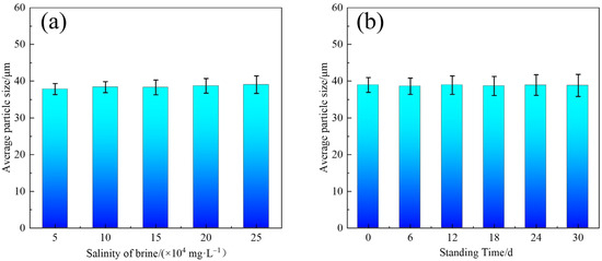 Effects of salinity and standing time on the average particle size of the dispersions. (a) The effect of salinity of brine on average particle size; (b) the effect of standing time on the average particle size.