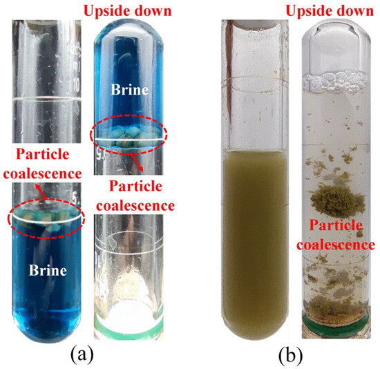 The temperature of deep carbonate reservoirs generally exceeds 120 °C, and even some ultra-high temperature reservoirs exceeding 180 °C have been found, which puts forward higher requirements for the temperature resistance of water-plugging agents. In this part, the thermal stability of the PE composite particles was evaluated. The PE composite particles were dispersed in brine with a salinity of 2.5 × 105 mg/L and sealed in thermo-resistant and pressure-resistant glass bottles. The dispersions were placed in 200 °C and 120 °C thermostats, respectively, to observe the change in particle morphology. It can be seen from Figure 7 that after 30 days of high temperature aging, the particles did not decompose, but gathered together to form agglomerates. Especially after aging at 200 °C, the formed agglomerate could even seal the brine at the bottom of the inverted glass bottle, as shown in Figure 7a. The preliminary bottle test results showed that the prepared PE composite particles had excellent thermal stability, and the temperature tolerance could reach above 200 °C.