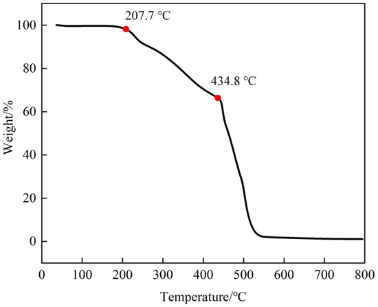 In order to further evaluate the thermal stability of PE composite particles, thermal degradation behavior was investigated. Thermal degradation methods, including thermogravimetric (TG) analysis and differential scanning calorimetry (DSC), are commonly used to evaluate the temperature resistance of materials [38,39]. From the TG curve in Figure 8, it can be seen that PE composite particles began to decompose slowly at 207.7 °C and decomposed rapidly at 434.8 °C. The TG curve showed two obvious inflection points because PE composite particles were processed by multiple components. Since the decomposition temperature of the dispersant (sodium dodecyl sulfate) in the PE composite particles was about 200 °C, it can be inferred that the first inflection point of the TG curve was caused by the decomposition of the dispersant. However, the PE main agent and the cosolvent (petroleum resin) with high proportions of mass began to decompose rapidly after 400 °C. The TG results indicated that the temperature resistance of the prepared PE composite particles reached above 200 °C.