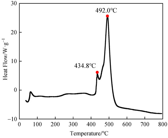 In addition, it can be seen from the DSC curve shown in Figure 9 that there were two obvious endothermic peaks during the heating process of the PE composite particles, which were at 434.8 °C and 492.0 °C, respectively. This is because the main agent and the cosolvent in the composite particles are both thermoplastic materials, and both of them absorb a lot of heat after being heated, resulting in structural changes. Combined with the TG data, although the mass had a certain loss, the main structure was not destroyed after the PE composite particles were heated to above 207.7 °C. This indicates that the prepared PE composite particles have excellent temperature resistance of above 200 °C and fully meet the application requirements of ultra-deep reservoirs with high temperature.