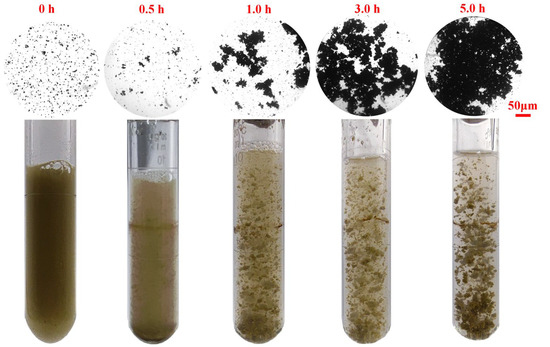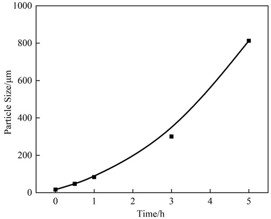 From the macroscopic photograph of the dispersions in the glass bottles in Figure 10, it can be seen that the particles were uniformly dispersed at the beginning and gradually agglomerated after aging for about 1 h. The dynamic process of particle aggregation can be seen more accurately from the microscopic photos. After high-temperature aging for 0.5 h, only a small number of particles agglomerated, and the diameter of the agglomerations was about 50–100 μm. After high-temperature aging for more than 1 h, the aggregation rate increased significantly, and a large number of agglomerations with diameter of about 200 μm were observed. With the further extension of high temperature aging time, the size of the agglomerations reached hundreds of microns. Furthermore, the change in average particle size in dispersion with aging time was measured, as shown in Figure 11. It can be seen that the average particle size increased from 16.5 μm to more than 812.7 μm, and the coalescence expansion ratio reached dozens of times, which was consistent with the results shown in the photos in Figure 10. The coalescence characteristics of the PE composite particles at high temperature are conducive to effective plugging of fractures after the particles have been injected into high-temperature reservoirs. It is worth noting that the PE composite particles coalesce rapidly only under static conditions. In the flow state, the particles are basically not agglomerated, so there is no need to worry about the problems of particle agglomeration and injection difficulties during the injection process.