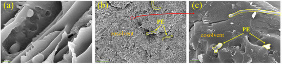 The microstructure of the composite material determines its performance characteristics [40]. In this part, the microstructure characteristics of the PE main agent and the prepared PE composite particles were analyzed by the scanning electron microscope (SEM). The SEM images are shown in Figure 12. It can be seen that the micro-morphology of the PE main agent is with a fibrous structure, while that of the prepared PE composite particles is with a dense flake structure. This indicated that the addition of additives significantly changed the microstructure of the PE main agent. At the same time, it can be seen from Figure 12b,c that the PE and the cosolvent (petroleum resin) are mixed uniformly, and small-sized fibrous PE is uniformly dispersed in the cosolvent, indicating that the PE and the cosolvent have good compatibility. In general, material with a fibrous structure has high tenacity, which is not conducive to its pulverization [41,42,43]. However, after adding the cosolvent and the tenacity-reduction agent, the structure of the PE composites changed from a fibrous structure to a dense flake structure, which significantly reduced the tenacity of the material. This is the main reason why the prepared PE composites could be pulverized to the micrometer scale.