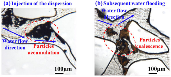 The premise of effective plugging by the PE composite particles is the retention and accumulation of the particles in flow channels. It was found during the experiments that the PE composite particles were easier to accumulate at positions where the fracture width changed, as shown in Figure 13a. After the injection of the particles, under the action of high temperature, the particles coalesced with each other or adhered to the surface of the fracture. The coalescence and adhesion of the particles formed effective plugging in the channeling fracture, which caused the subsequently injected water to be diverted to other regions and thus improved the sweep efficiency of subsequent water flooding, as shown in Figure 13b.