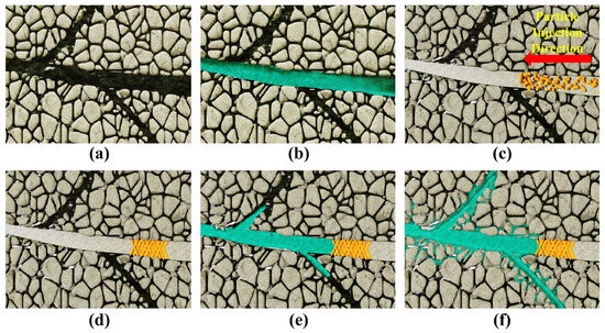 Schematic diagram of the water plugging mechanism by the PE composite particles: (a) initial state reservoir; (b) water flooding; (c) injection of PE composite particles; (d) plugging of large-sized fracture; (e) subsequent water flooding; (f) remaining oil recovery.