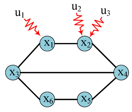 Here, the concept of driver node density is employed to assess the controllability of the network. In Figure 3, input nodes , , and send control signals to nodes and , which are referred to as controlled nodes. When a controlled node is influenced by only one control signal, it is called a driver node. In Figure 3, serves as a driver node. The driver node density, denoted as , is defined as follows [22]: