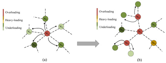 An example of the cascading failure process. The nodes represent partial locations in the network, the dashed lines indicate the connections between nodes, and the solid lines represent the direction of load redistribution after node failures. The colors of the nodes represent their respective states, where green, yellow, and red indicate nodes in underloading, heavy-loading, and overloading states, respectively. The darker the color, the heavier the load on the node. In (a), node is in an overloading state, and after the failure, the load should be distributed among neighboring nodes. In (b), it represents the state of this set of nodes after the load redistribution of . Nodes and also become overloading, and becomes heavy-loading. This process will be repeated until the network stabilizes or collapses.