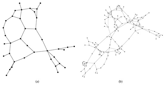 (a) The network topology of the IEEE 39-node system; (b) the network topology of the Chinese 132-node system.