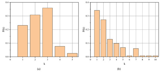The power-side electrical network topology established on the basis of the IEEE 39-node system and the Chinese 132-node system is shown in Figure 5a and Figure 5b, respectively. The IEEE 39-node system consists of a total of 10 generators, 39 busbars, and 12 transformers. In contrast, the Chinese 132-node system represents a more streamlined provincial network consisting of 25 generators, 101 loads, and 180 transmission lines. The degree distribution for both systems is shown in Figure 6, and the statistical characteristics of the networks are summarized in Table 1.