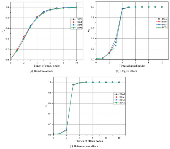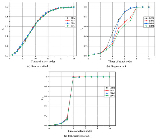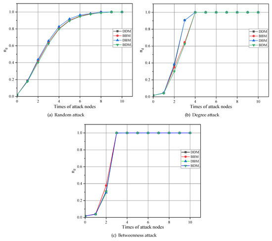 Figure 9 shows the controllability changes of a CPPS constructed with a BA network as its information network topology under different attack strategies. (a), (b), and (c) represent the controllability variation curves of the system under random, degree, and betweenness attack strategies, respectively. When the system is subjected to random attacks, the density of driver nodes gradually increases, while the controllability of the system decreases. The system is already in a state of collapse when the number of attacks reaches about 20. Meanwhile, under degree attacks, the controllability of the CPPS constructed with DDM and DBM strategies differs significantly from that of the CPPS constructed with BBM and BDM strategies when the number of attacks reaches 4. In comparison, the changes in the controllability of the CPPS under BBM and BDM strategies are relatively small when faced with multiple-node attacks, allowing for greater opportunities for system adaptation. Finally, under betweenness attacks, the system suddenly collapses when subjected to the fourth attack, and before that, the CPPS under all four coupling strategies was in a partially dysfunctional state.