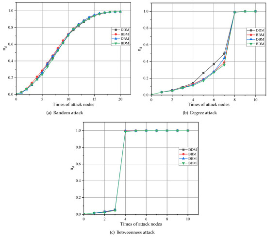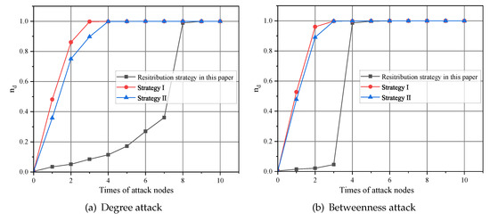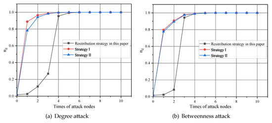 Network attacks can be divided into static and dynamic attacks. Static attacks refer to the attack sequence that has been determined when the system is established, while dynamic attacks dynamically adjust the attack sequence based on the real-time status and load of the system. Different from static attacks [34], this paper adopts dynamic attack strategies to make the attacks more targeted, and the network that survives this situation has higher stability. This section compares the load redistribution strategy introduced in this paper with the load redistribution strategies in other studies in the literature [35,36], and it analyzes the impact of different load redistribution strategies on the network controllability under different attack strategies.