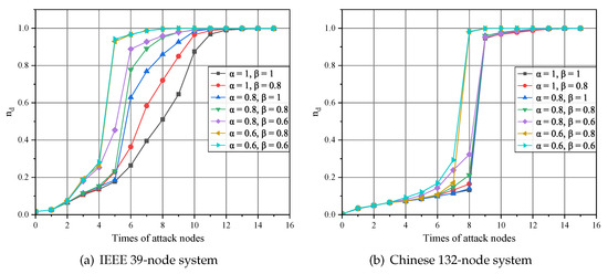 The load redistribution model proposed in this paper was validated, and its controllability changes during the process were analyzed using the IEEE standard 39-node system and the Chinese 132-node system. This paper assumes the assurance of complete synchronization between the power system and the information system, and unless otherwise specified, the system capacity parameters and are 0.5, respectively. The horizontal axis in the graph of this section, times of attacks, represents the system’s change in terms of controllability after enduring x instances of node attacks. The simulations in this paper were performed using MATLAB 2020b on a personal computer equipped with an Intel Core i5 2.4 GHz CPU and 16 GB RAM.