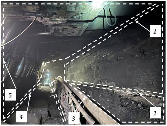 View of the longwall, where its significant areas are marked: (1) coal sidewall, (2) path of the combine shearer, (3) scraper conveyor, (4) crew passage path, and (5) powered roof support.