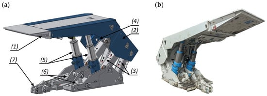 View of the powered roof support section: design (a), canopy (1), shield support (2), lemniscate mechanism (3), ceiling support actuator (4), hydraulic actuators (5), floor base (6), beam of sliding system (7), and prototype (b).