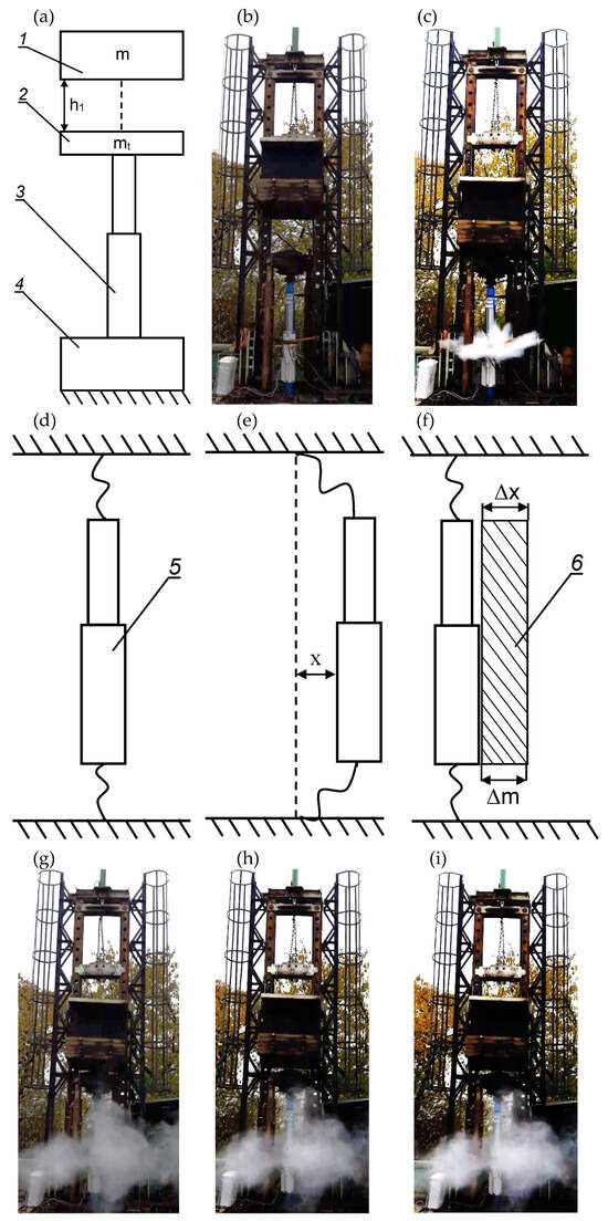 Stand for testing hydraulic actuators of powered roof support loaded with mass impact: (a) construction of a test stand, 1—impact mass, 2—traverse, 3—hydraulic stand cylinder with pressure sensor, 4—foundation of the position; (b) view of the test bench located at TLO Opava in the Czech Republic; (c) view of the hydraulic actuator after the dynamic test; (d) actuator analysis, 5—vibrating rack surface after dynamic impact; (e) the amplitude of harmonic vibrations was created; (f–i) air layer formed after a dynamic impact; 6—air layer.