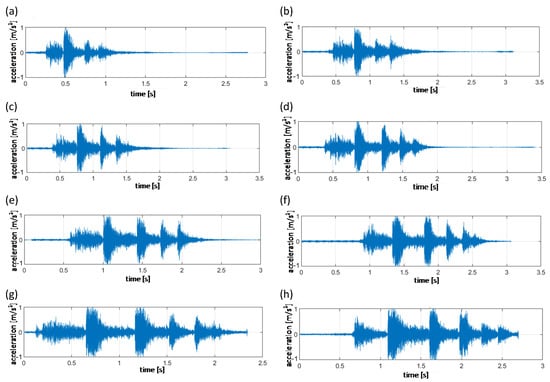 The obtained test results for the resulting real signal, where the height of the drop for a particular measurement was as follows: (a) drop height of 0.2 m, (b) drop height of 0.3 m, (c) drop height of 0.4 m, (d) drop height of 0.5 m, (e) drop height of 0.6 m, (f) drop height of 0.7 m, (g) drop height of 0.8 m, and (h) drop height of 0.9 m.