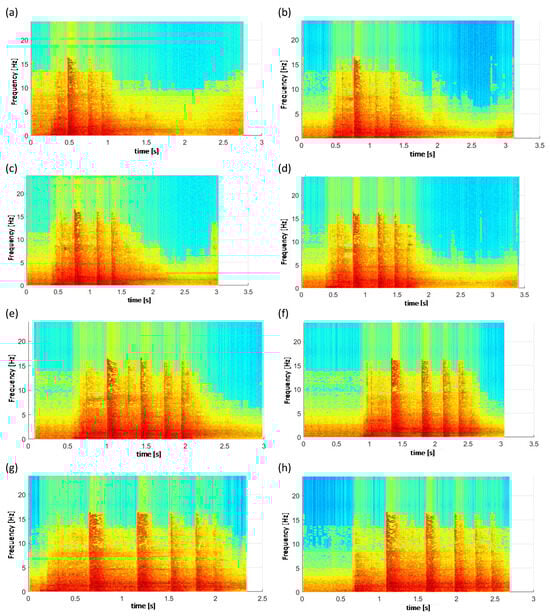 Spectrogram of data from the obtained dynamic impact for the resulting real signal, where the drop height for each measurement was as follows: (a) drop height of 0.2 m, (b) drop height of 0.3 m, (c) drop height of 0.4 m, (d) drop height of 0.5 m, (e) drop height of 0.6 m, (f) drop height of 0.7 m, (g) drop height of 0.8 m, and (h) drop height of 0.9 m.