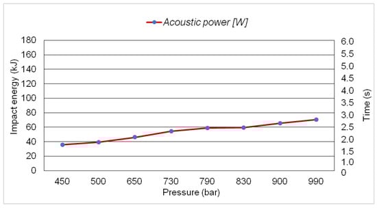 The results show that (see Figure 6) the alignment of the power intensity during impact is one of the criteria that can determine the usefulness or suitability of the hydraulic actuator of powered roof support. Objective measurement of this parameter is fraught with several difficulties, the greatest of which is the impossibility of accurately measuring the energy transmitted through the position beam. The sound power method can solve this problem by using the energy obtained to reference the power intensity for individual hydraulic shocks.