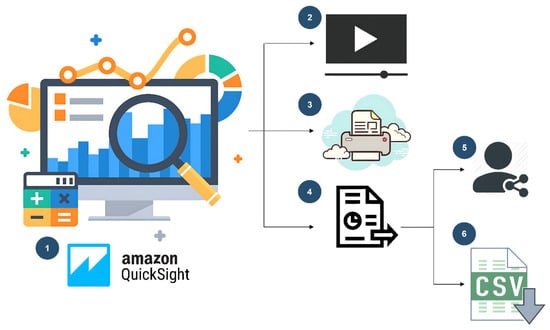 In that sense, a cloud-based solution emerges as a highly interesting proposal to optimise and enrich data visualisation, an essential process that involves the graphical representation of intricate information and data in a visually appealing and understandable way []. This approach involves the transformation of complex data into visual elements, such as elaborate graphs, descriptive charts and interactive maps, with the aim of simplifying and making more accessible the understanding of latent patterns, trends and relationships within the information [,]. For example, Quicksight is a data visualisation and analysis tool developed by Amazon Web Services (AWS). It is available as a cloud service and is intended to facilitate data exploration and understanding for both businesses and professionals. Although it offers a free version with limitations, it also provides scalable payment plans to meet the needs of users with varying levels of demand and complexity in their data analytics projects.