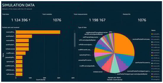 Quicksight allows several dashboards to be produced once the data has been uploaded and preprocessed for analysis and visualisation. Figure 3 shows a dashboard made from the different insights offered by the cloud tool, focused on the objective of the project, which is to visualise the information on the performance of the LTE network in smart meters. We can see in the figure some KPIs with information on the total data, total simulated modules with their IDs, the total measurements that were made in the meters during the simulation, bar charts with the number of packets sent and received and a pie chart with the types of data that were obtained from each meter in the simulation. This dashboard helps a lot to make decisions when moving the simulated project to the real world. We can see how feasible it will be to implement these smart meters in the homes of the people of the city of Cañete. It also allows us to review if you need to adjust some methodologies or tools to save time and money in order to achieve the goal of transforming the city of Cañete into a smart city.