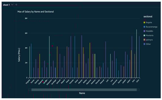 Next, Figure 4 shows another type of graph that can be used for analysis and visualisation, as well as other models that can be applied to observe which one is best suited for the work to be carried out. This is a bar graph where information is displayed on the maximum and minimum salaries of some collaborators, and the legend indicates which city it belongs to, related to the colour of the bar that is represented. We observe a graph that we use to make reports on the salary rhythm that the company manages and of each sector where it belongs to, for decision-making in the areas of human resources, accounting and treasury.