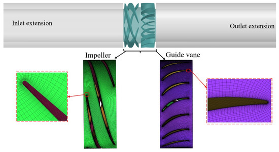 Structured meshing of the computational domain was performed using the commercial software ICEM CFD 16.0 and TurboGrid 16.0. The boundary layer is arranged close to the wall, the total number of layers of the boundary layer mesh is 13, the height of the first layer of the mesh is 0.06 mm, and the growth rate is set as 1.2; the Y+ of the guide vane and impeller blade surface is less than 30, which basically meets the computational requirements of the SST k-ω turbulence model [25,26], and the computational domain mesh is shown in Figure 2.