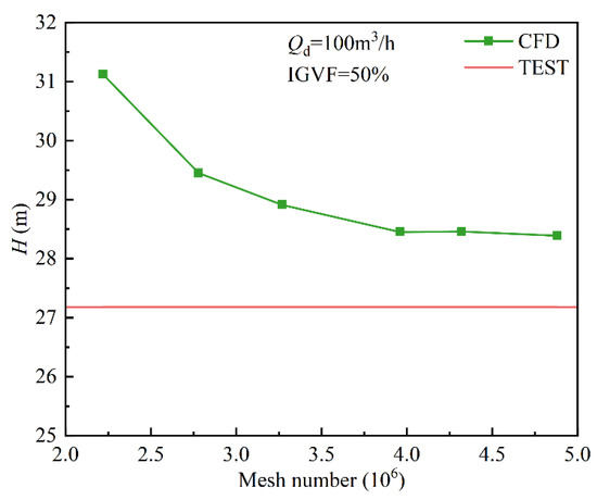To avoid the influence of the number of grids on the computational results, six sets of grids with different numbers are used for grid-independent verification. Grid irrelevance was judged by reaching a stabilized value of the multiphase pump head at the designed flow rate and inlet gas volume fraction of 50%. Figure 3 shows that the head deviation is 0.05% when the number of grids is more significant than 4328312. Considering the numerical simulation accuracy and computational resources, the total number of grids in the whole computational domain is determined to be 4328312.
