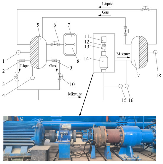 Gas–liquid two-phase flow pump performance test bench: 1, 4, 15, 16, 18—pressure gauge; 2—electromagnetic flowmeter; 3—liquid inlet valve; 5—low-pressure tank; 6—gas valve; 7—air compressor; 8—air compressor control room; 9—flowmeter; 10—gas inlet valve; 11—electromotor; 12—coupling; 13—torque sensor; 14—model pump; 17—medium-pressure tank.