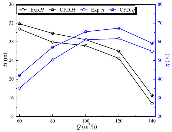 This numerical simulation method is verified based on different flow conditions at IGVF = 50%. Figure 5 shows the comparison of the external characteristic curves of the two-phase numerical simulation and experiment. As can be seen from the figure, the curves for different flow conditions have a consistent trend, and the relative deviation between head and efficiency is between 5% and 10%. Owing to the complexity and unpredictability of the gas–liquid two-phase flow, there are inevitable friction loss and hydraulic loss errors between its experimental and numerical simulation results. Therefore, numerical simulations and experiments have an error of 10% or less at the designed flow point, which is within acceptable limits.