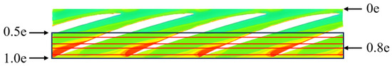 To more accurately design separated trailing edge flap blades with excellent transport performance, it is necessary to explore the locations where gas-phase fluid media accumulate and block the flow channel specifically. The location of the gas-phase aggregation in the original model’s impeller channel is analyzed using the finite volume method. In the case of multiphase pumps transporting gas-liquid two-phase fluid medium, the gas-phase medium tends to aggregate significantly near the impeller hub and at the outlet of the flow passage. Therefore, the analyzed area is set as the back half of the 0.1-times blade height development surface of the impeller channel of the multiphase pump; e is the axial length of the impeller at 0.1 times the height of the blade, i.e., 0.5e~1.0e of the axial length. As shown in Figure 7, the 0.5e~1.0e region was divided into areas at 0.1e intervals, and the gas phase aggregation in each area was analyzed.