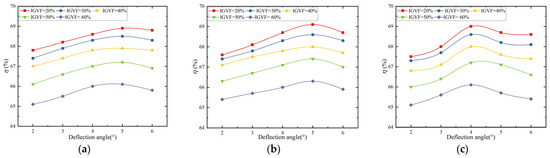 Efficiency curves of different flap lengths: (a) 0.20 l; (b) 0.25 l; (c) 0.30 l.