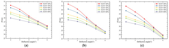 Figure 9 and Figure 10 illustrate the external characteristic curves of the multiphase pump under different deflection angles and flap lengths (0.20 l, 0.25 l, and 0.30 l). It can be observed that as the inlet gas volume fraction increases, the efficiency and head of the different schemes exhibit a decreasing trend, consistent with the variation pattern of the original model. When the length of the trailing edge flap remains constant, the efficiency of the multiphase pump shows an increasing trend followed by a decreasing trend as the deflection angle increases, with an optimal efficiency point. When the trailing edge flap length is between 0.20 l and 0.25 l, the pump’s optimal efficiency point corresponds to an angle of deflection of 5°. In these cases, the efficiency at a 50% inlet gas fraction increased by 2.85% and 3.40%, respectively, compared to the original model. However, when the trailing edge flap length is 0.30 l, the pump’s optimal efficiency point corresponds to a 4° deflection angle, resulting in a 2.71% improvement in efficiency compared to the original model at a 50% inlet gas volume fractions. Under different lengths of the trailing edge flap, the head continuously decreases with an increasing deflection angle. The reason for this phenomenon is that the deflection of the trailing edge flap towards the suction surface reduces the curvature of the original airfoil, thereby decreasing the blade’s pressure-raising performance and resulting in a decrease in the pump’s head.