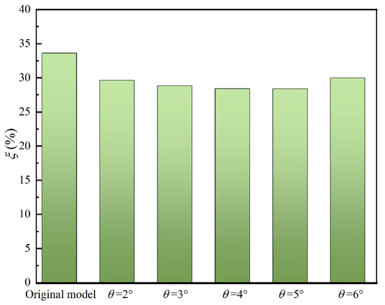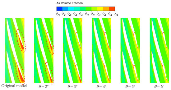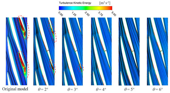 Figure 12 shows the gas-phase streamlines diagram at 0.1 times the blade height of the impeller channel for a trailing edge flap length of 0.25 l and a deflection angle θ = 2°~6°. Within the original model, a pronounced dissipation vortex is observed at the trailing edge of the suction side of the blade, as shown by the red circle in the diagram. This phenomenon corresponds with the region of the highest gas-phase accumulation at this location. This observation clarifies that when the gas phase medium accumulates to a certain extent, it triggers the formation of dissipation vortices. This dissipative vortex is generated due to the flow instability of the gas–liquid two-phase flow. The instability and energy transfer of the vortex structure itself can result in a significant energy loss in the impeller channel. With a constant trailing edge flap length, when θ = 3°, there is only a small amount of energy dissipation. As the deflection angle progressively increases, the dissipation vortex structure at the trailing edge of the suction side of the blade dissipates. This demonstrates that increasing the deflection angle of the trailing edge flap can effectively enhance the flow state of the gas-phase fluid medium.