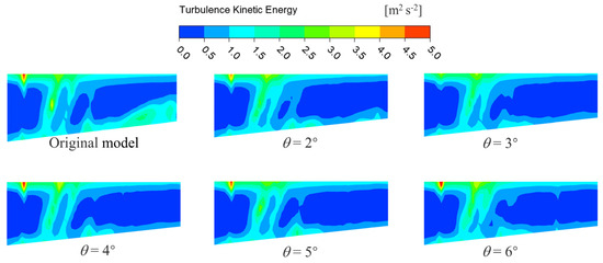 Figure 13 shows the cloud diagram of turbulent kinetic energy distribution in the impeller meridian surface at a trailing edge flap length of 0.25 l and a deflection angle of θ = 2°~6°. The distribution of turbulent kinetic energy visually reflects the internal flow losses in multiphase pumps with different blade structures. In the region of the impeller inlet, proximate to both the hub and shroud regions, there is a substantial gradient variation in turbulent kinetic energy. This is because the multiphase medium substantially impacts the blades and impeller walls when flowing into the impeller, causing the flow state in this region to become turbulent, resulting in partial energy loss. In the middle channel of the inlet, a notable region of heightened turbulent kinetic energy exists. This occurrence can be attributed to the dissimilarity in the physical properties of the multiphase medium. Once the medium enters the impeller, the distinct phases experience varying force interactions, giving rise to gas–liquid separation phenomena. This, in turn, leads to a disturbed flow state in the region.