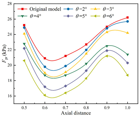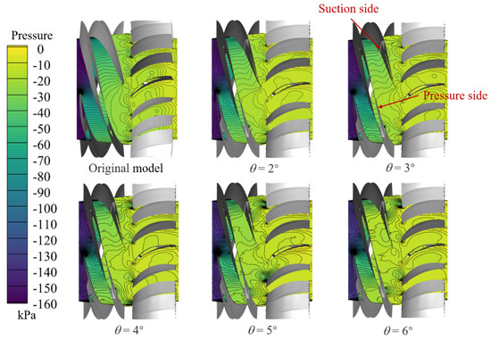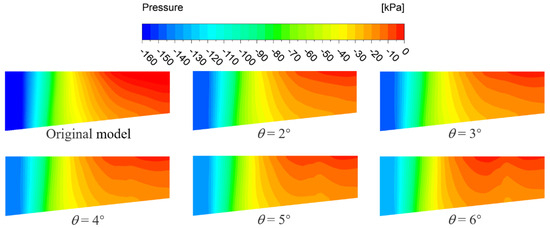To explore the influence of altering the deflection angle of the trailing edge flap on the degree of gas–liquid separation within the impeller channel, an analysis of the pressure distribution along the meridional plane of the impeller channel is conducted. This investigation seeks to elucidate variations in the radial pressure gradient under different scenarios. Figure 15 presents contour plots of the pressure distribution along the meridional plane for both the original model and the trailing edge flap scheme with a length of 0.25 l, spanning deflection angles from θ = 2° to 6° at the designed flow rate and 50% inlet gas volume fraction. Evidently, as shown in the Figure 15, the pressure distribution in the trailing edge flap scheme concurs with that of the original model. In the first half of the impeller channel, a gradual axial pressure rise results in a noticeable axial pressure gradient, owing to the rapid axial compression of the fluid. However, in the latter half of the channel, the axial pressure rise progressively becomes more gradual.