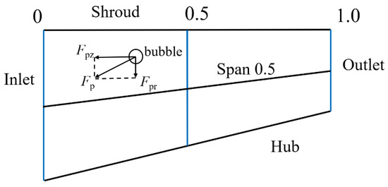 In multiphase pumps, as the flowing medium passes through the impeller channels, the work capacity of the blades increases the kinetic energy of the fluid, which generates a higher pressure at the pressure surface. This pressure differential induces a gradient between the pressure and suction sides, compelling the gas to accumulate at the suction side. Furthermore, as the fluid flows from the inlet to the outlet, pressure gradually increases in this direction, leading to a pressure gradient that causes the gas to aggregate in the flow channel towards the outlet. Hence, it is essential to study the pressure gradient in the impeller channel to improve the performance of multiphase pumps and prevent the gas phase from accumulating. A more detailed analysis of pressure data at different positions along the meridional plane of the impeller channel is conducted. This analysis is illustrated in Figure 16, where Fpr denotes the radial pressure gradient and Fpz signifies the pressure gradient along the streamline direction. The positions are labeled as follows: 0 corresponds to the inlet of the impeller channel, 0.5 represents a position at 0.5 times the axial distance from the impeller channel, and 1.0 denotes the exit of the impeller channel.