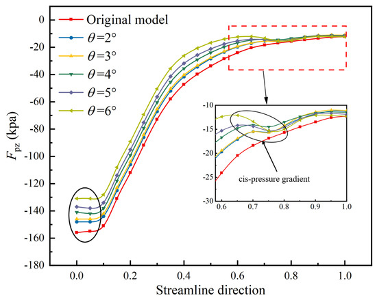 For a more in-depth exploration of the impact of trailing edge flap deflection angle variations on the pressure gradients within the impeller channel of the multiphase pump, pressure data were extracted from both the original model and the trailing edge flap scheme with a length of 0.25 l and deflection angles θ = 2° to 6°. Pressure variation curves along the streamline direction were plotted, as illustrated in Figure 19. From the elliptical black outline area in the figure, it can be observed that the pressure at the entrance of the impeller, when using the trailing edge flap schemes, is notably higher than in the original model. As the trailing edge flap deflection angle increases, the pressure at the impeller entrance gradually rises. The pressure values at the impeller outlet are similar. This indicates that the design of the separated trailing edge flap causes the blades to deflect toward the suction side, thereby reducing the blade’s pressurizing capacity.