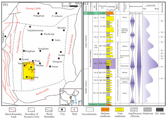 (a) Location of the study area; (b) structure units of the study area; (c) comprehensive stratigraphic column of the Triassic Yanchang Formation in the Ordos Basin (modified from Yang et al. [34] and Sun et al. [35]).