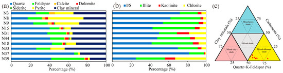 The samples had abundant quartz, clay minerals, feldspar, and pyrite, with contents of 17.4–66.5 wt% (mean of 36.5 wt%), 17.0–43.5 wt% (mean of 31.2 wt%), 3.8–34.8 wt% (average of 15.3 wt%), and 1.6–37.6 wt% (average of 13.3%), respectively (Figure 2a), according to the XRD analysis. Clay minerals were mainly illite/smectite (I/S) mixed layers, with contents of 25.0–82.0% (mean of 54.8%), followed by illite (16.0–45.0%). The average contents of chlorite and kaolinite were 5.7% and 9.5%, respectively (Figure 2b). The content of highly brittle minerals was an important indicator for effective fracturing. In this study, quartz, feldspar, carbonate minerals, and pyrite are considered brittle minerals [39]. The contents of brittle minerals was in the range of 56.7–83.1% (mean of 9.4%), similar to the shale from the Qingshankou Formation [39].