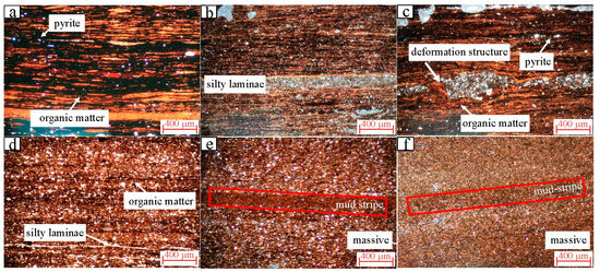 Thin section photographs: (a) N3 (Sample id), dark layer of organic matter, bright particles of pyrite (white arrow); (b) N8 (Sample id), light area are silty laminae; (c) N9 (Sample id), dark layer of organic matter, bright particles of pyrite, plastic deformation structures (white arrow); (d) N15 (Sample id), dark layer of organic matter, light area of silty laminae; (e,f) N31 and N44 (Sample id), dark layer containing mud stripe (red zone); (a–d) laminar; (e,f) massive. Cross-polarized light.