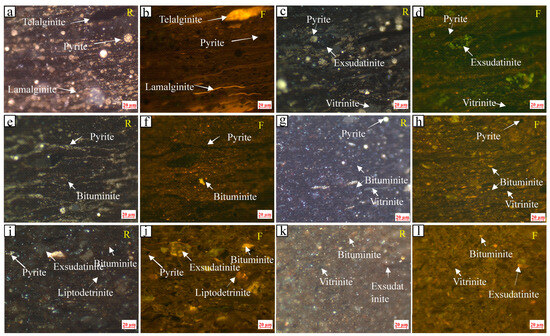 Photomicrographs of the Chang 7 shale: (a,b) N3, pyrite, telalginite, lamalginite; (c,d) N8, vitrinite, exsudatinite; (e,f) N9, pyrite, bituminite; (g,h) N15, vitrinite, bituminite; (i,j) N31, exsudatinite, liptodetrinite; (k,l) N44, vitrinite, exsudatinite. F = fluorescent light, R = reflected white light).