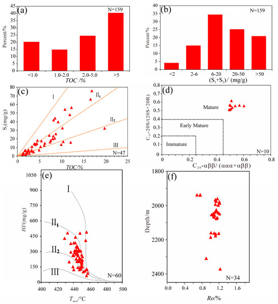 Distribution frequency diagram of TOC and (S1 + S2) (a,b); plots of S2 versus TOC (c); HI versus Tmax, showing type II1-II2 kerogen (e); and maturity parameters of the Chang 7 shale (d–f). The orange lines in (c) represent the boundaries of different kerogen types.