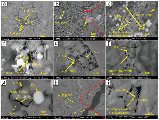 Pore features of the Chang 7 shale (OM: organic matter, Py: pyrite, InterP: interparticle, IntraP: intraparticle: (a) N3, OM pores; (b,c) N8, OM pores, IntraP pores within clay aggregates; (d) N9, InterP pores; (e) N15, InterP pores; (f) N15, IntraP pores within clay aggregates; (g) N31, fracture pores; (h,i) N44, IntraP pores within clay aggregates).