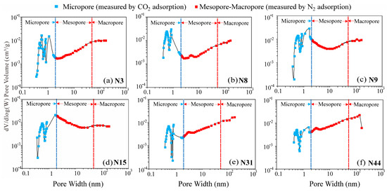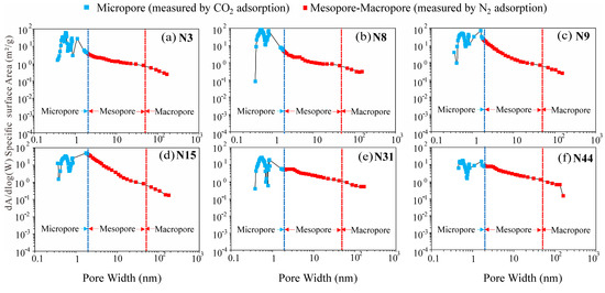 The PSD curve can provide important information, including the pore size range and the contribution of different pores to total PV and SSA [50,54]. Quantitative characterization of PSD can be ascertained by combining the adsorption results of N2 and CO2 (Figure 9 and Figure 10). The PSD shows the multipeak distribution. The main peaks are distributed at 0.4~0.8 nm and 10~100 nm (Figure 9 and Figure 10). Mesopores are the largest contributor to PV, accounting for 53.2%, followed by macropores and micropores, which account for 30.4% and 16.4%, respectively. The average contribution rate of micropores to SSA is 63.8%, that of mesopores is 34.6%, and that of macropores is 1.6%, which all decrease sequentially.